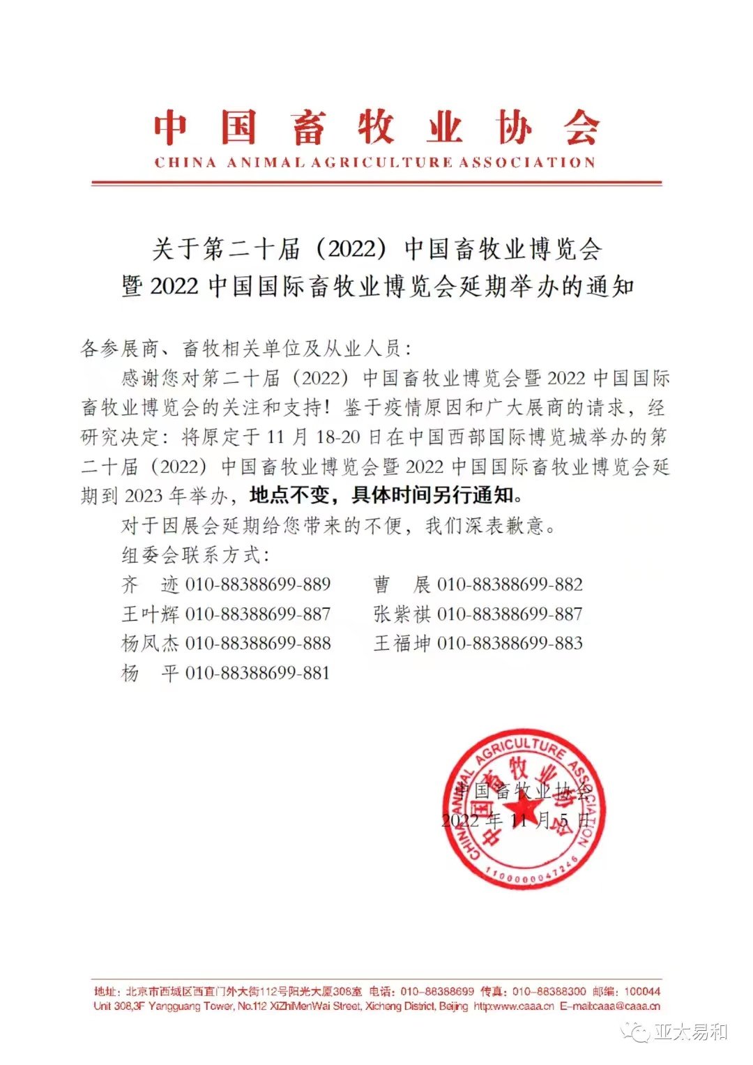 第二十屆(2022)中國畜牧業(yè)博覽會(huì)暨2022中國國際畜牧業(yè)博覽會(huì)延期到2023年舉辦